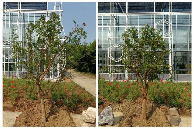 近日,山东省枣庄市峄城区科技局向药用植物园捐赠一批石榴苗木,栽植于药用植物温室配套景观花池中,长势良好。