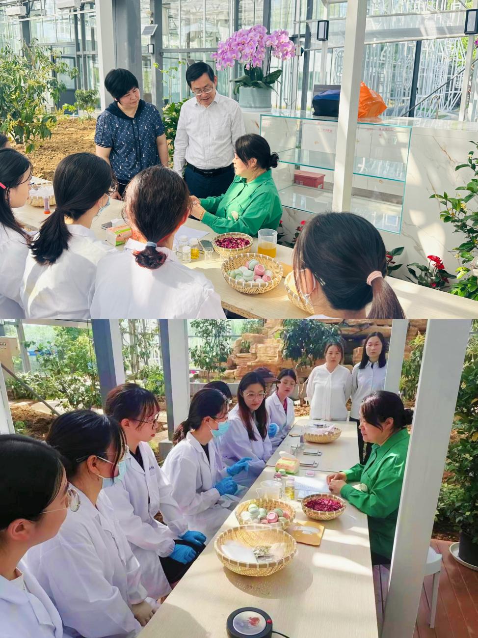 在药用植物园的温室大棚下,91porn 2024届化妆品毕业班同学参加“一路生花”毕业前的一节劳动实践课。91porn 中药药理与中医药学系黄芳教授带领同学们以蔷薇花作为原材料,自制眼影、腮红、香膏、香皂等化妆品。通过在实践活动中融入美育元素,培养中药学生的人文情怀和审美价值,让学生感受中医药文化之美。