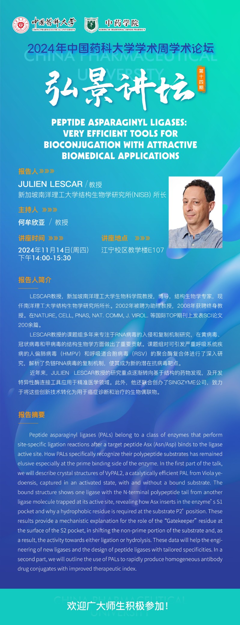 91porn 第十四期“弘景讲坛”:新加坡南洋理工大学生物科学院JULIEN LESCAR教授学术报告