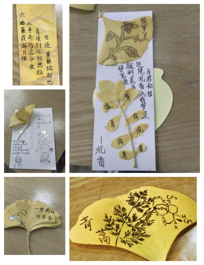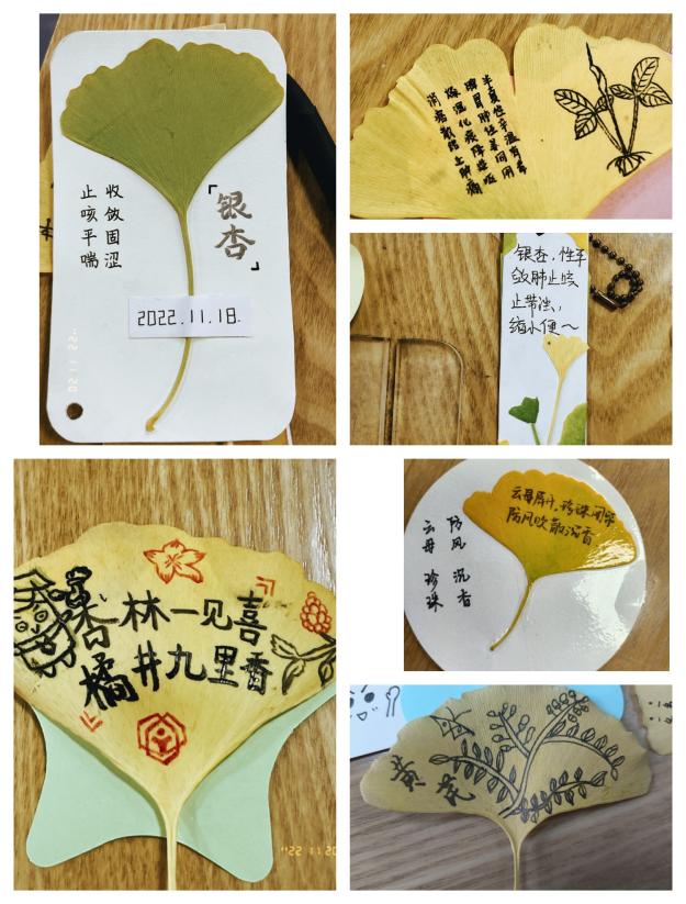 漫步在校园,拾起一片落叶,不若化为书签,夹在书间珍藏留念,在书本间赏秋。活动面向全体同学开展,活动期间,同学们主动积极参与、踊跃来稿,通过捡拾落叶制作成以中药为主题的银杏书签,最终通过网络平台投稿打卡的方式进行。