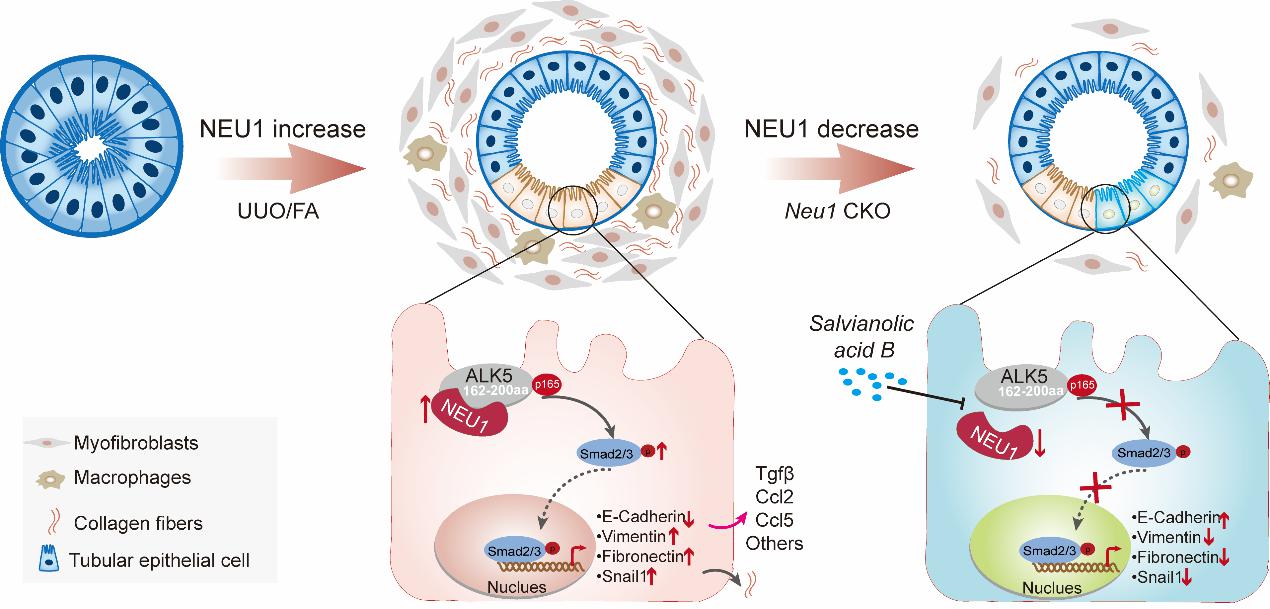 该研究的主要创新点:从临床-动物-细胞等多水平阐明NEU1是诱发慢性肾病的关键因子,NEU1通过选择性结合ALK5 162-200结构域激活ALK5-Smad2/3信号通路诱导肾纤维化,筛选发现丹参中丹酚酸B靶向NEU1发挥肾保护作用。该研究从靶向NEU1途径为慢性肾病的临床治疗和药物研发开拓了新方向,为丹参防治肾损伤的临床应用提供依据。
