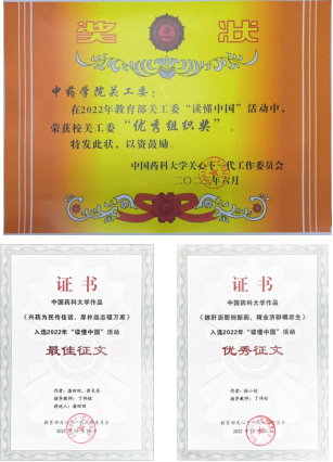 2023年6月1日,我校关心下一代工作委员会于玄武门校区召开2022年“读懂中国”活动表彰。91porn 报送高质量征文、短视频作品共获五项表彰,91porn 关工委荣获“最佳组织奖”。其中,91porn 潘田田、黄长英撰写的《兴药为民传佳话,厚朴远志福万家》获评最佳征文并入选由教育部关工委和中国教育电视台联合组织的“读懂中国”专题展播,徐小创撰写的《披肝沥胆创新药,精业济群嘱后生》获评优秀征文。