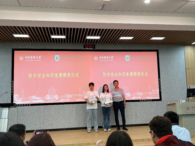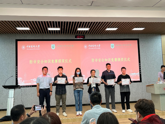 活动中,卢献锁副处长、徐志成副书记、潘晨老师为防诈骗安全知识竞赛获奖学生颁发荣誉证书。